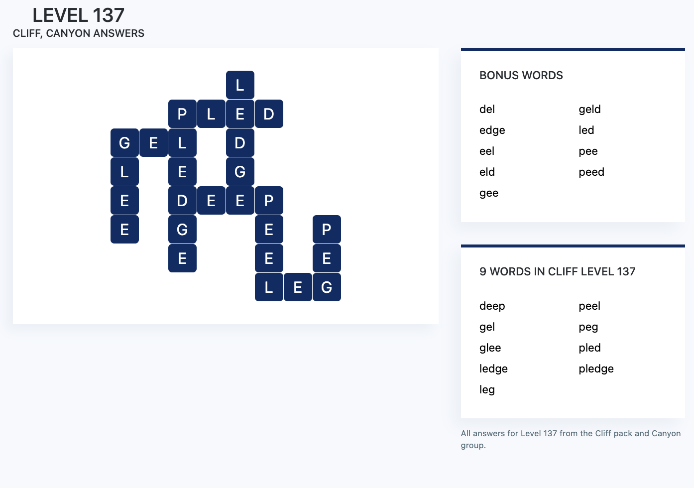 Bonus Words: DEL, EDGE, EEL, ELD, GEE, GELD, LED, PEE, PEED