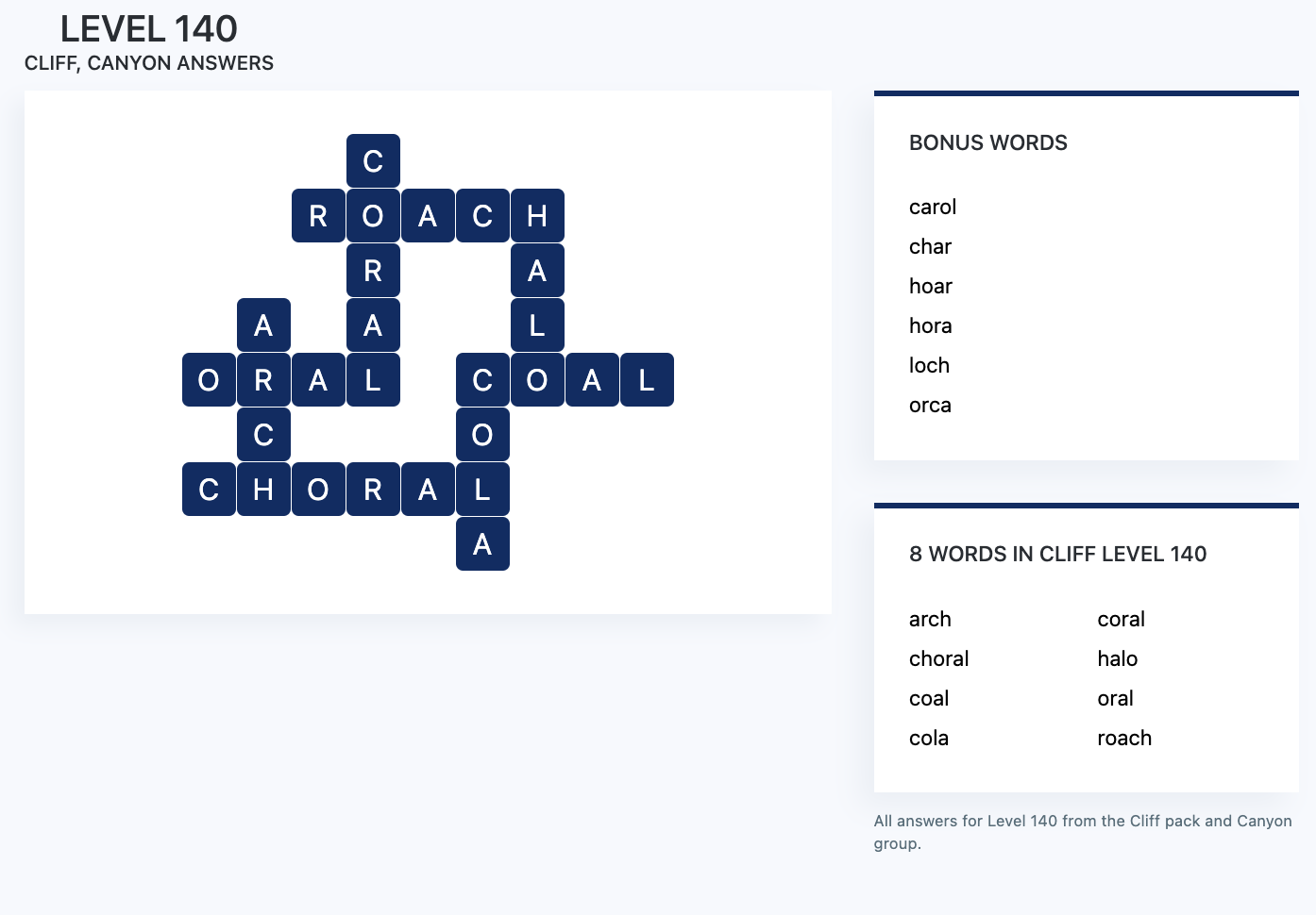 We publish the answers to all levels for Wordscapes, one of the most popular word games. You can find answers and bonus words for Wordscapes level 140 on this page. Please note that there are more than 60 thousand levels in the Wordscapes word game and you can find all the answers on our site.