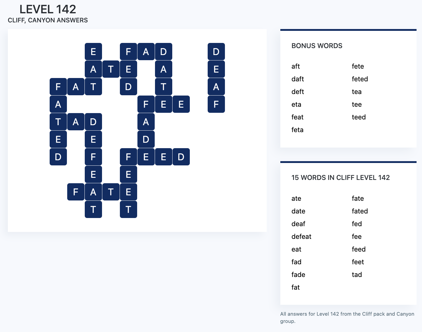 We publish the answers to all levels for Wordscapes, one of the most popular word games. You can find answers and bonus words for Wordscapes level 142 on this page. Please note that there are more than 60 thousand levels in the Wordscapes word game and you can find all the answers on our site.