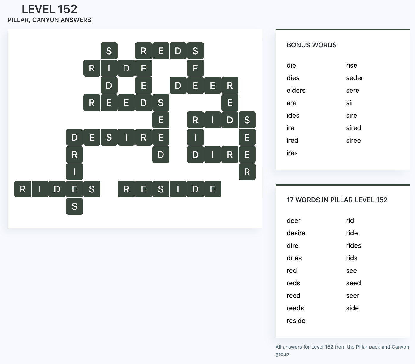 We provide solutions for all tiers in the highly popular word game, Wordscapes. On this page, you’ll discover answers and bonus words specifically for Wordscapes level 152. It’s worth noting that Wordscapes boasts over 60,000 levels, and you can access answers for all of them right here on our website.