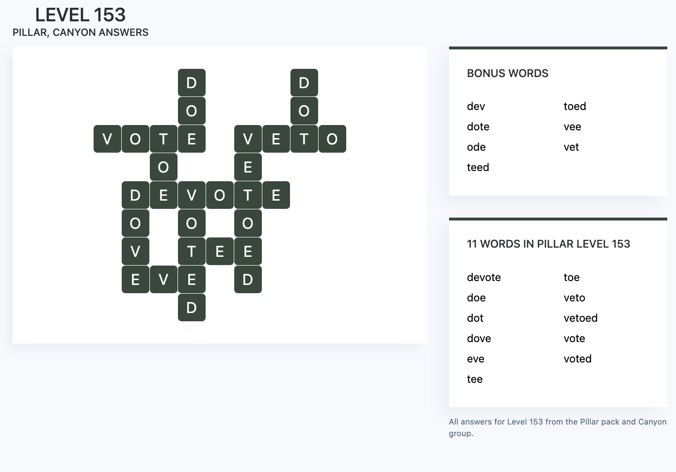 We provide solutions for all tiers in the highly popular word game, Wordscapes. On this page, you’ll discover answers and bonus words specifically for Wordscapes level 153. It’s worth noting that Wordscapes boasts over 60,000 levels, and you can access answers for all of them right here on our website.