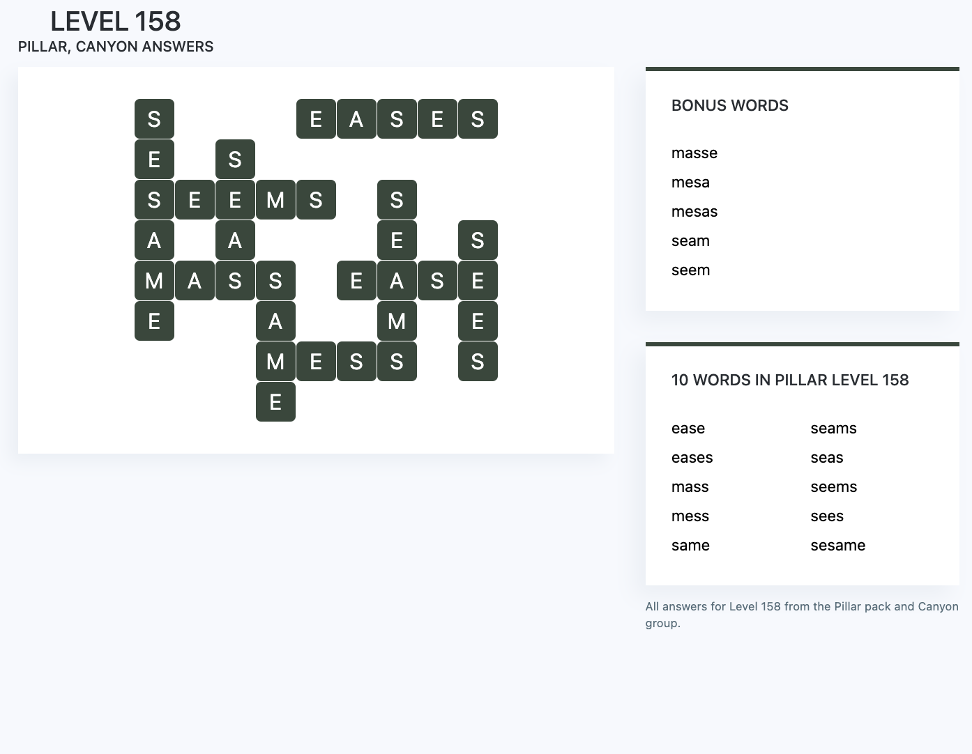 We provide solutions for all tiers in the highly popular word game, Wordscapes. On this page, you’ll discover answers and bonus words specifically for Wordscapes level 158. It’s worth noting that Wordscapes boasts over 60,000 levels, and you can access answers for all of them right here on our website.
