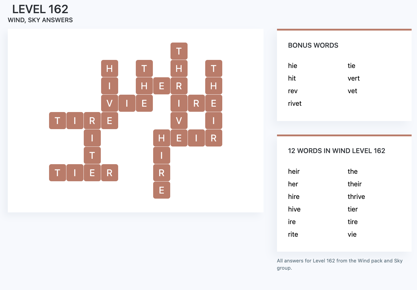 We provide solutions for all tiers in the highly popular word game, Wordscapes. On this page, you’ll discover answers and bonus words specifically for Wordscapes level 162. It’s worth noting that Wordscapes boasts over 60,000 levels, and you can access answers for all of them right here on our website.