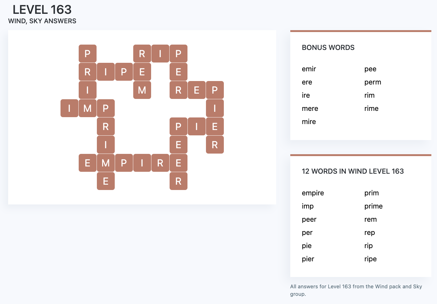 We provide solutions for all tiers in the highly popular word game, Wordscapes. On this page, you’ll discover answers and bonus words specifically for Wordscapes level 163. It’s worth noting that Wordscapes boasts over 60,000 levels, and you can access answers for all of them right here on our website.