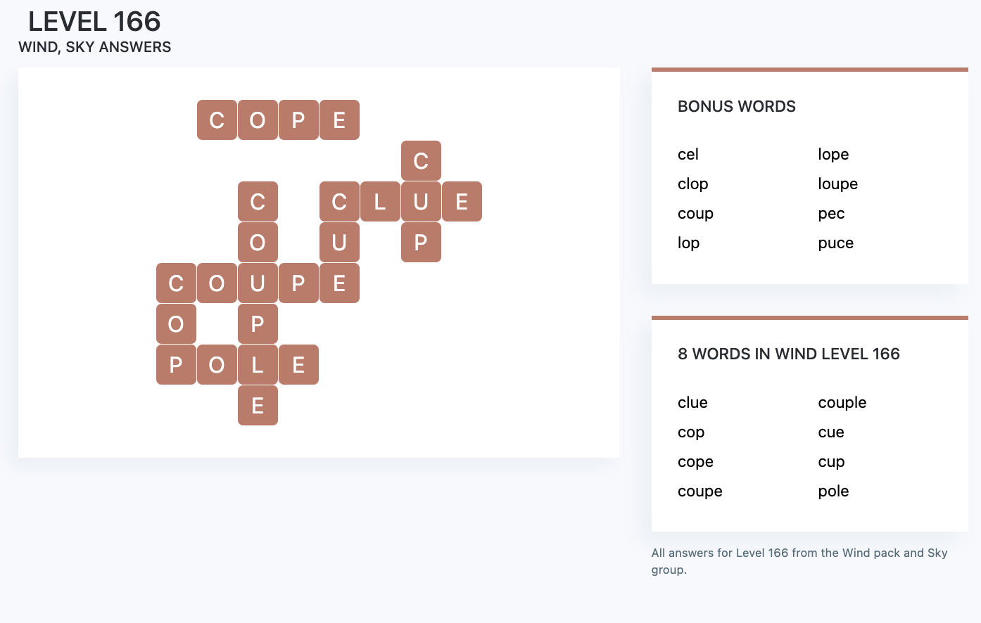 We provide solutions for all tiers in the highly popular word game, Wordscapes. On this page, you’ll discover answers and bonus words specifically for Wordscapes level 166. It’s worth noting that Wordscapes boasts over 60,000 levels, and you can access answers for all of them right here on our website.