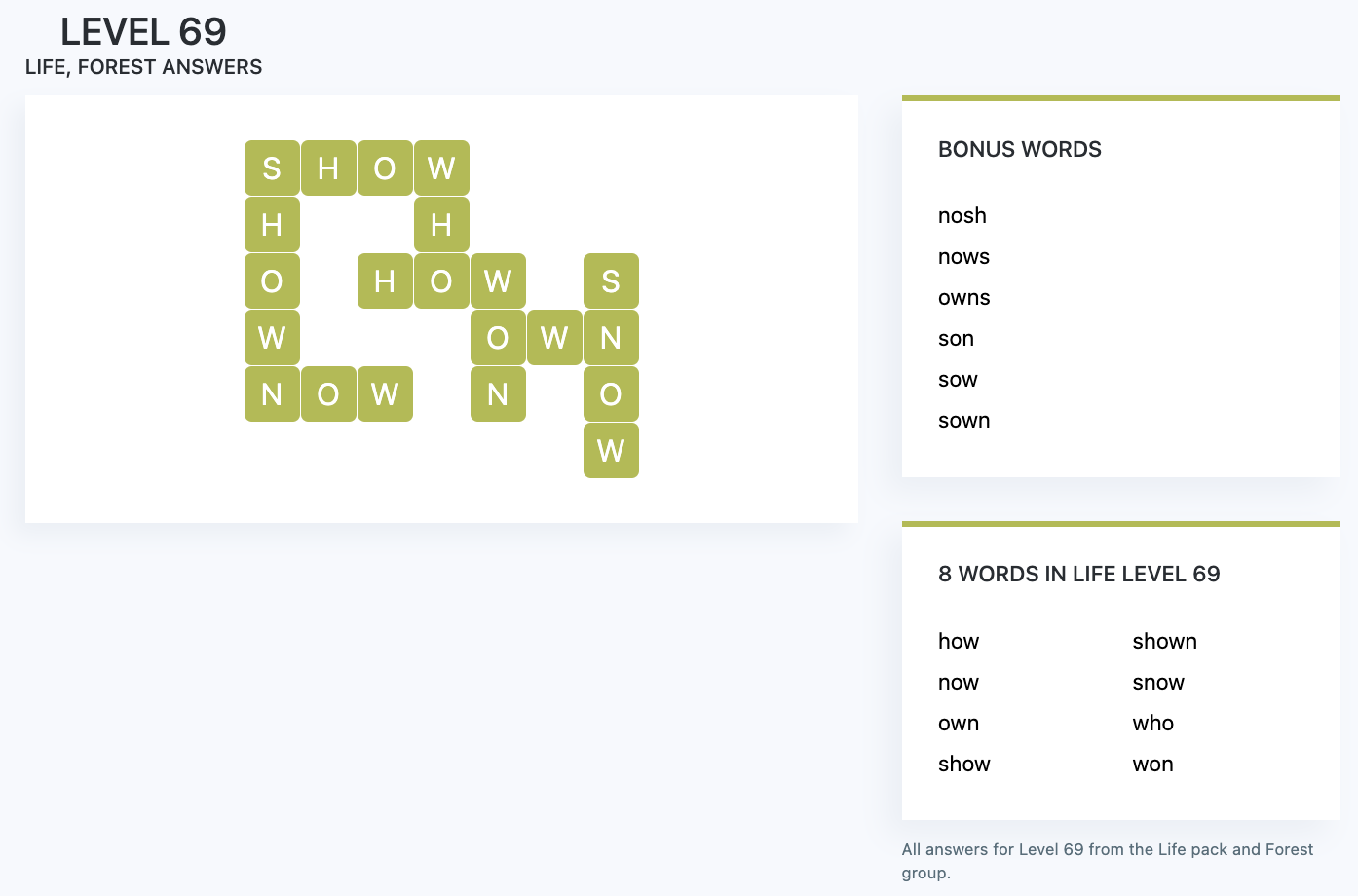 We publish the answers to all levels for Wordscapes, one of the most popular word games. You can find answers and bonus words for Wordscapes level 69 on this page. Please note that there are more than 60 thousand levels in the Wordscapes word game and you can find all the answers on our site.