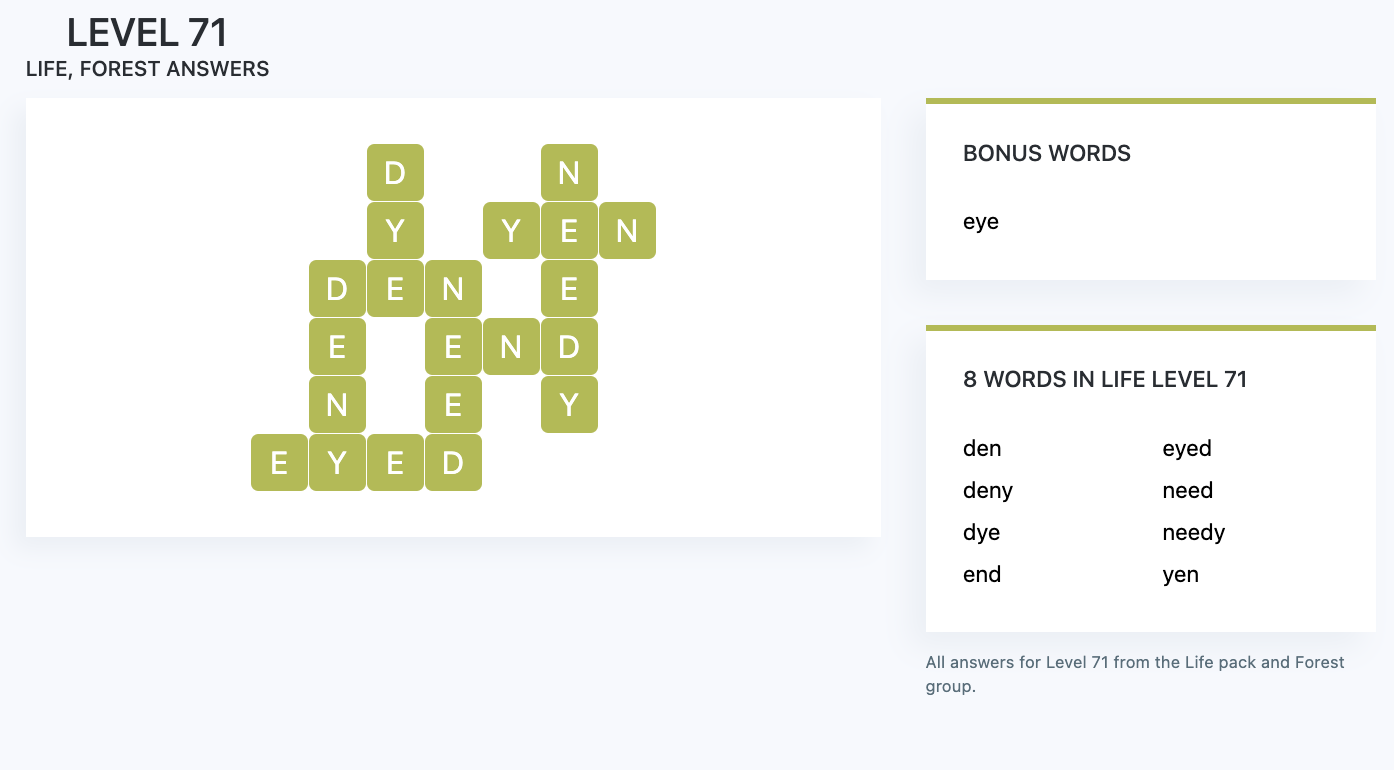 We publish the answers to all levels for Wordscapes, one of the most popular word games. You can find answers and bonus words for Wordscapes level 71 on this page. Please note that there are more than 60 thousand levels in the Wordscapes word game and you can find all the answers on our site.