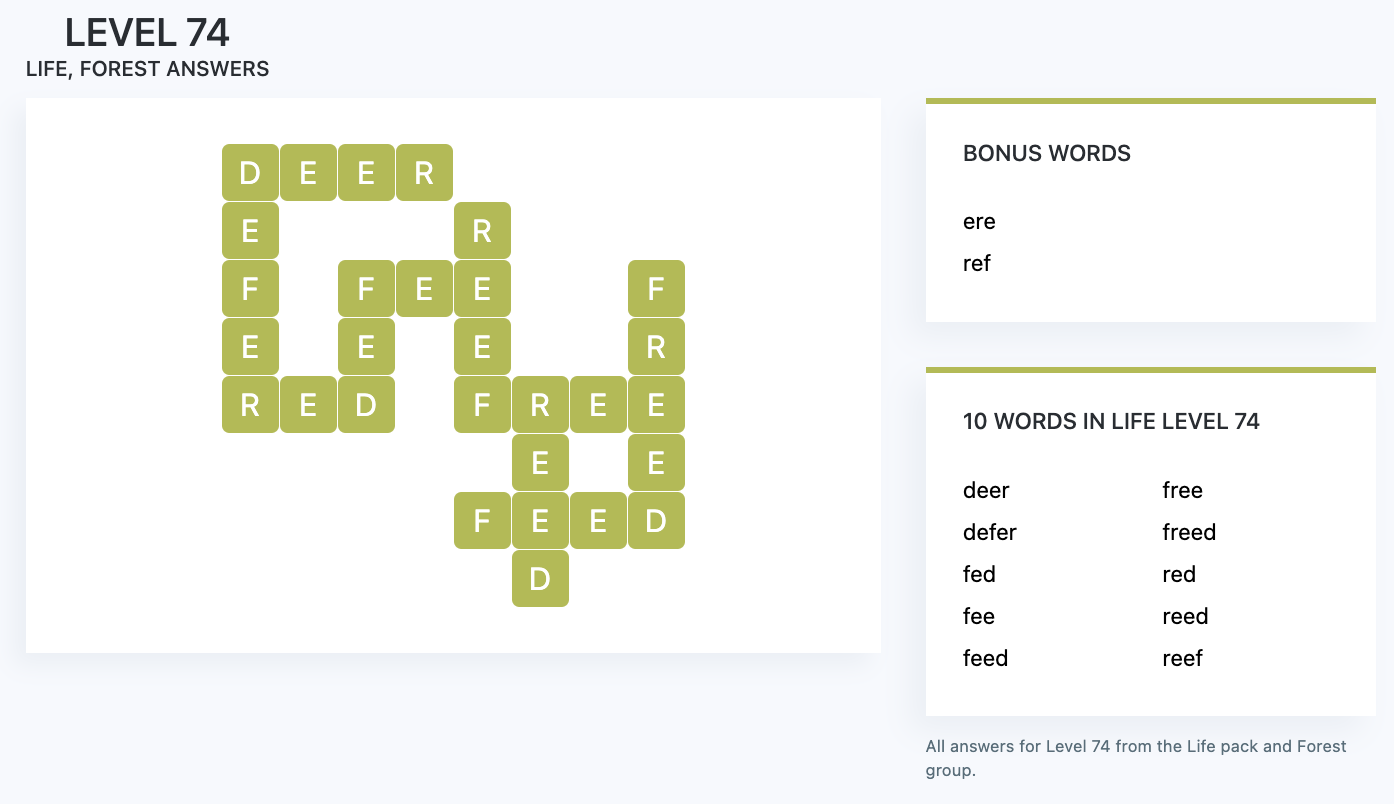 We publish the answers to all levels for Wordscapes, one of the most popular word games. You can find answers and bonus words for Wordscapes level 74 on this page. Please note that there are more than 60 thousand levels in the Wordscapes word game and you can find all the answers on our site.