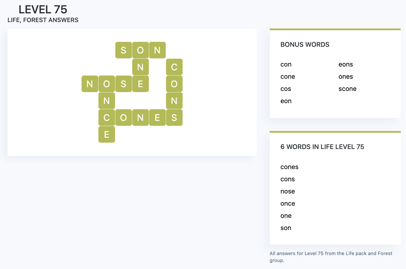 We publish the answers to all levels for Wordscapes, one of the most popular word games. You can find answers and bonus words for Wordscapes level 75 on this page. Please note that there are more than 60 thousand levels in the Wordscapes word game and you can find all the answers on our site.