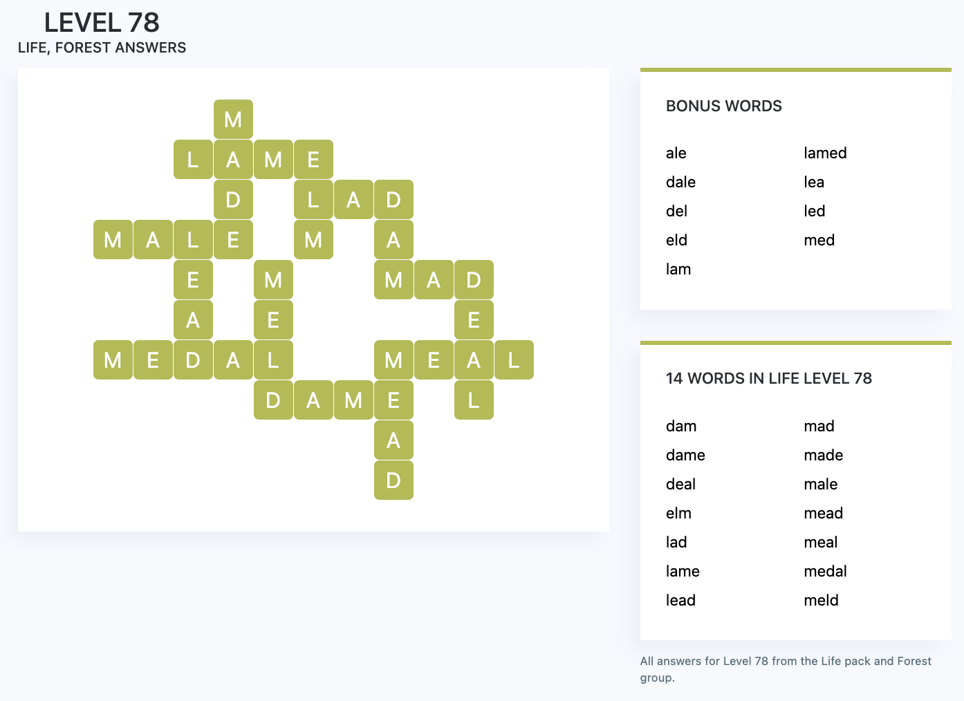 We publish the answers to all levels for Wordscapes, one of the most popular word games. You can find answers and bonus words for Wordscapes level 78 on this page. Please note that there are more than 60 thousand levels in the Wordscapes word game and you can find all the answers on our site.