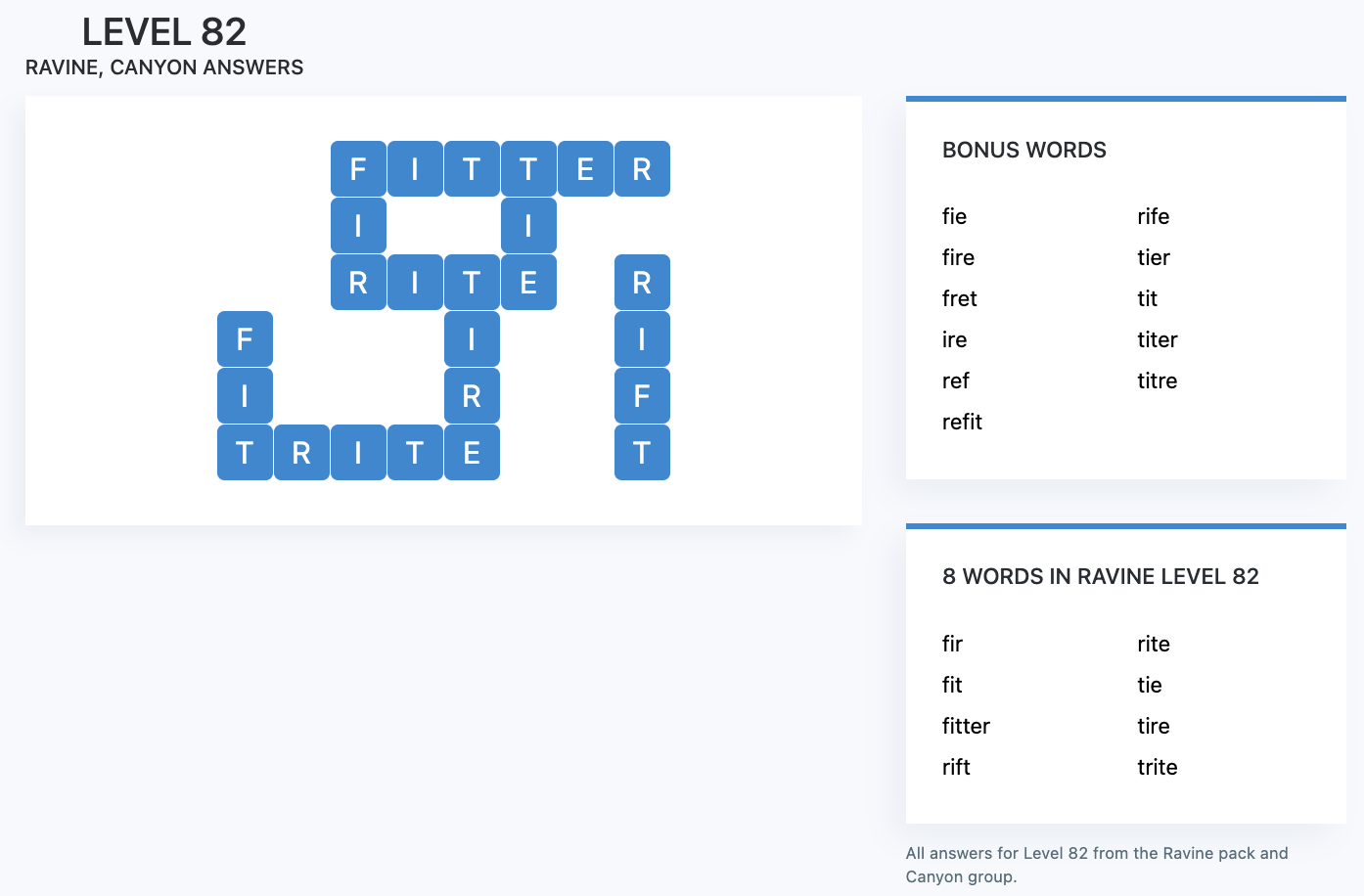 We publish the answers to all levels for Wordscapes, one of the most popular word games. You can find answers and bonus words for Wordscapes level 82 on this page. Please note that there are more than 60 thousand levels in the Wordscapes word game and you can find all the answers on our site.