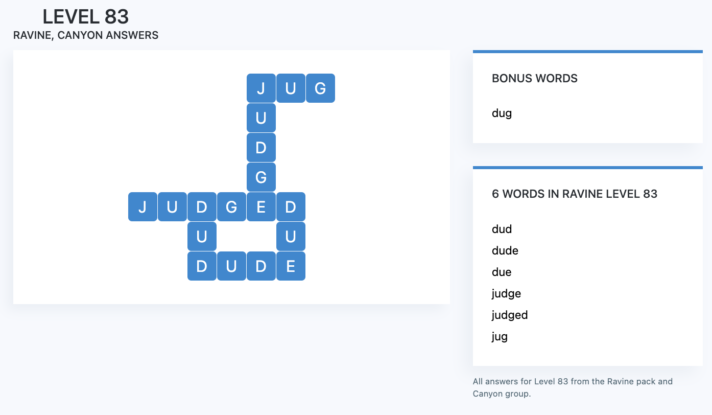 We publish the answers to all levels for Wordscapes, one of the most popular word games. You can find answers and bonus words for Wordscapes level 83 on this page. Please note that there are more than 60 thousand levels in the Wordscapes word game and you can find all the answers on our site.