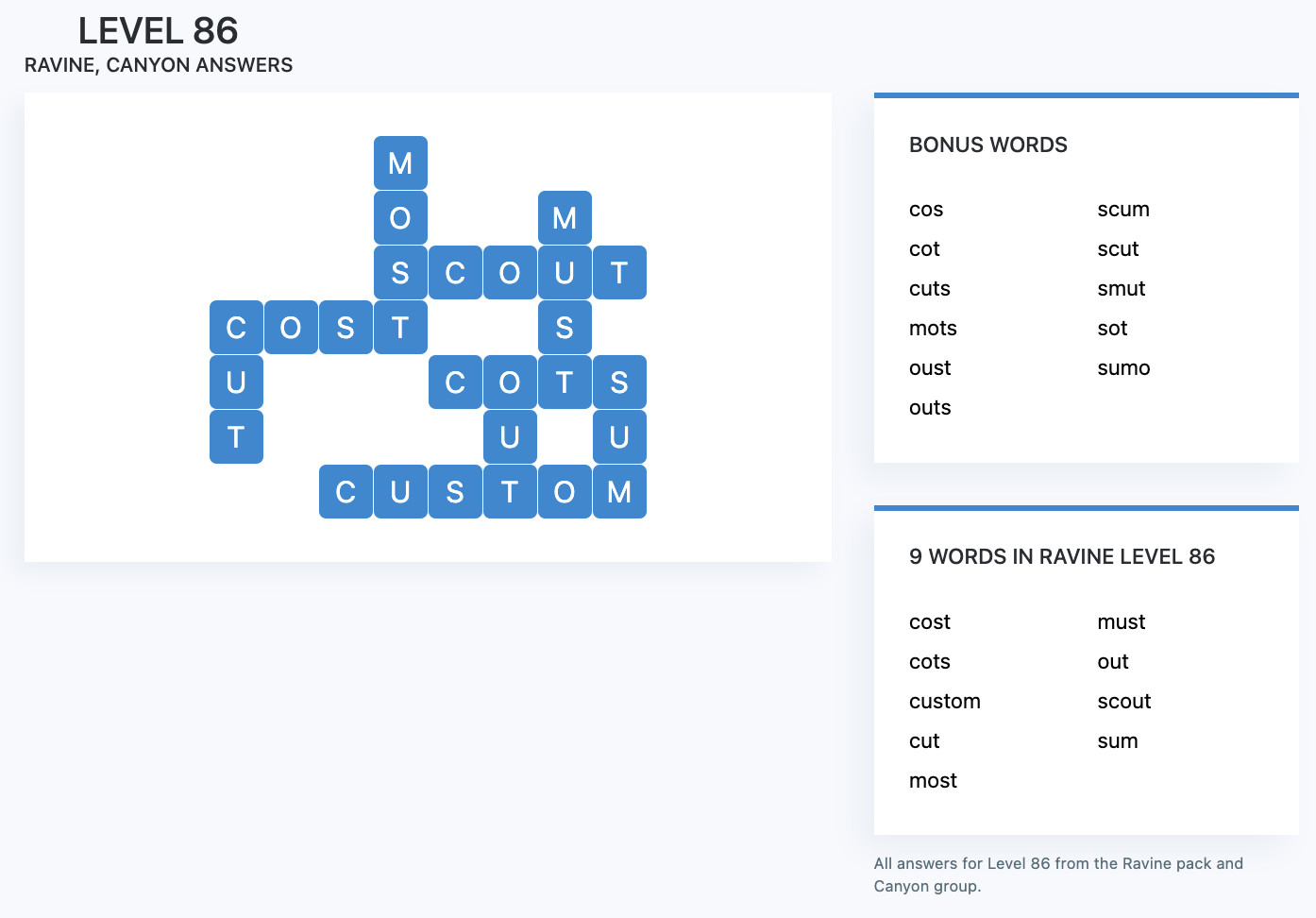We publish the answers to all levels for Wordscapes, one of the most popular word games. You can find answers and bonus words for Wordscapes level 86 on this page. Please note that there are more than 60 thousand levels in the Wordscapes word game and you can find all the answers on our site.