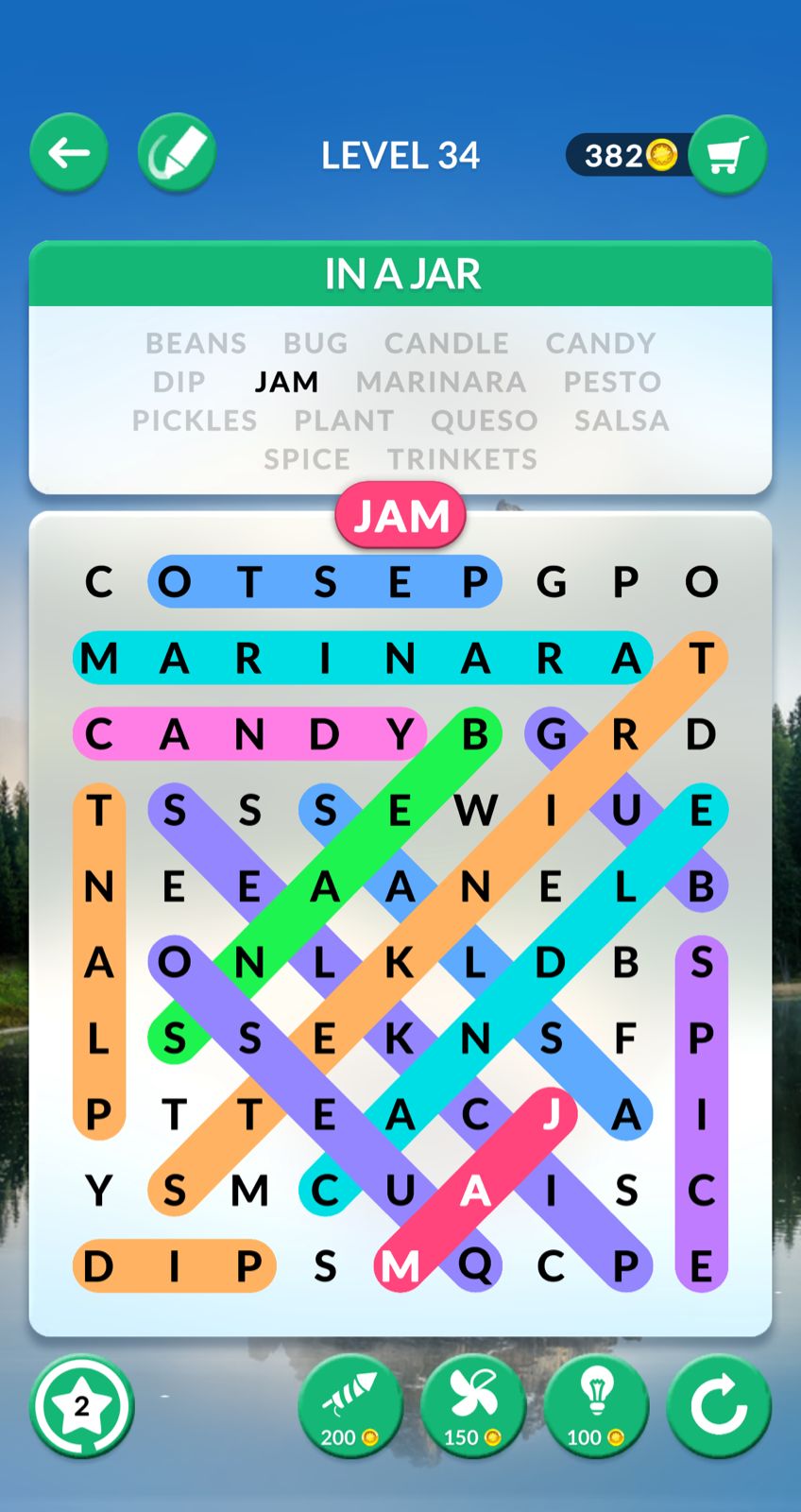 Wordscapes Search is a word find game published by PeopleFun. Some Levels of the game are quite difficult and sometimes you can use our help. We played and sharing here answers screenshot for Wordscapes Search Level 34 In a jar.