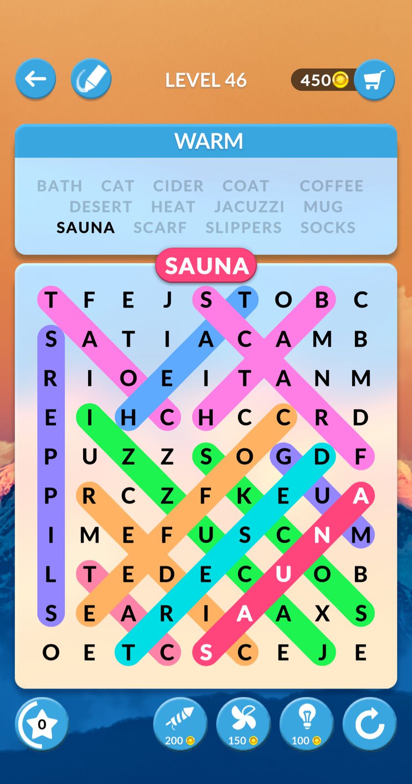 Wordscapes Search is a word find game published by PeopleFun. Some Levels of the game are quite difficult and sometimes you can use our help. We played and sharing here answers screenshot for Wordscapes Search Level 46 Warm.